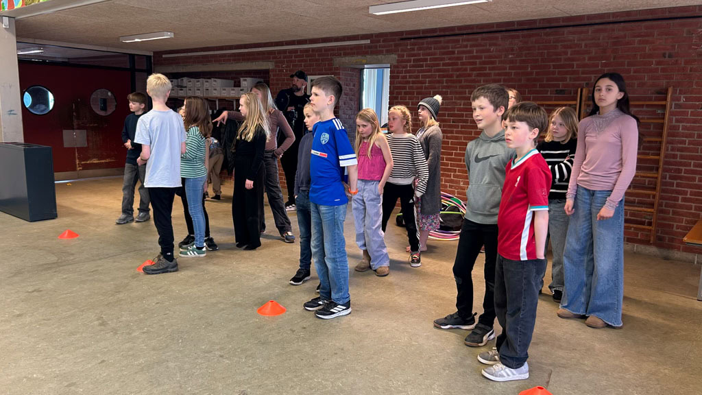 - Overvej om eleverne kan bevæge sig sammen eller om de kan bevæge sig på forskellige måder, fx kravle, hoppe, hinke eller baglæns, eller om de skal transportere en genstand, fx en bog på hovedet, en bold på en ske eller en ærtepose mellem knæene.
